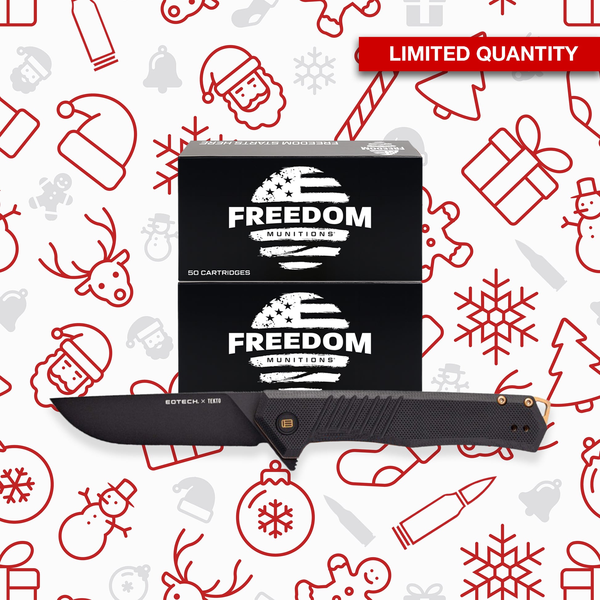 Take advantage of a rare, limited‑run bundle featuring 50 rounds of Freedom Munitions 5.56 55‑grain FMJ paired with the hard‑to‑find Tekto Knives F1 Alpha EOTECH Edition. Our 55‑grain FMJ rounds are built for reliable, consistent performance, perfect for training days, sight‑ins, and range sessions where accuracy and clean cycling matter. The F1 Alpha EOTECH Edition rounds out the bundle with premium craftsmanship: a D2 steel blade, smooth flipper action, and bold EOTECH‑branded accents that elevate this knife into true collector territory. With the knife constantly selling out and the bundle priced well below standard retail, this is one of the strongest value drops you’ll see. Stock is extremely limited, once these bundles are gone, they’re gone.
